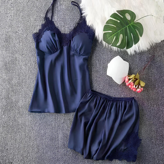 Completo vestaglia e camicia da notte in raso con spalline in corda, dettagli in pizzo sul petto e sulla schiena